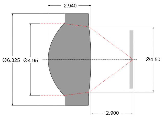 非球面透镜型号: 352230, EFL: 4.5mm, NA: 0.6, WD: 2.9mm, CA: 4.95/4.5mm, OD: 6.325mm