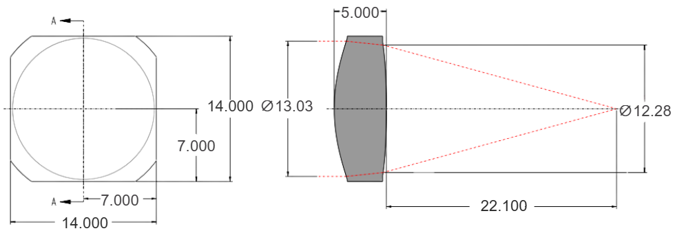 非球面透镜型号: 354068, EFL: 25.0mm, NA: 0.3, WD: 22.1mm, CA: 13.03/12.28mm, OD: 17.2mm